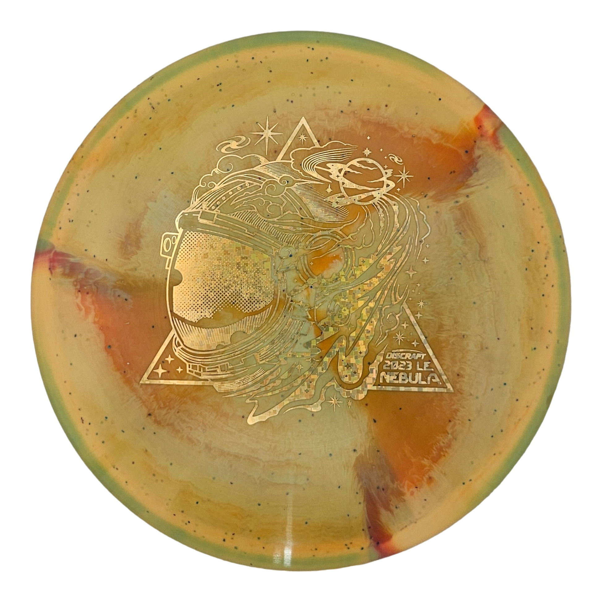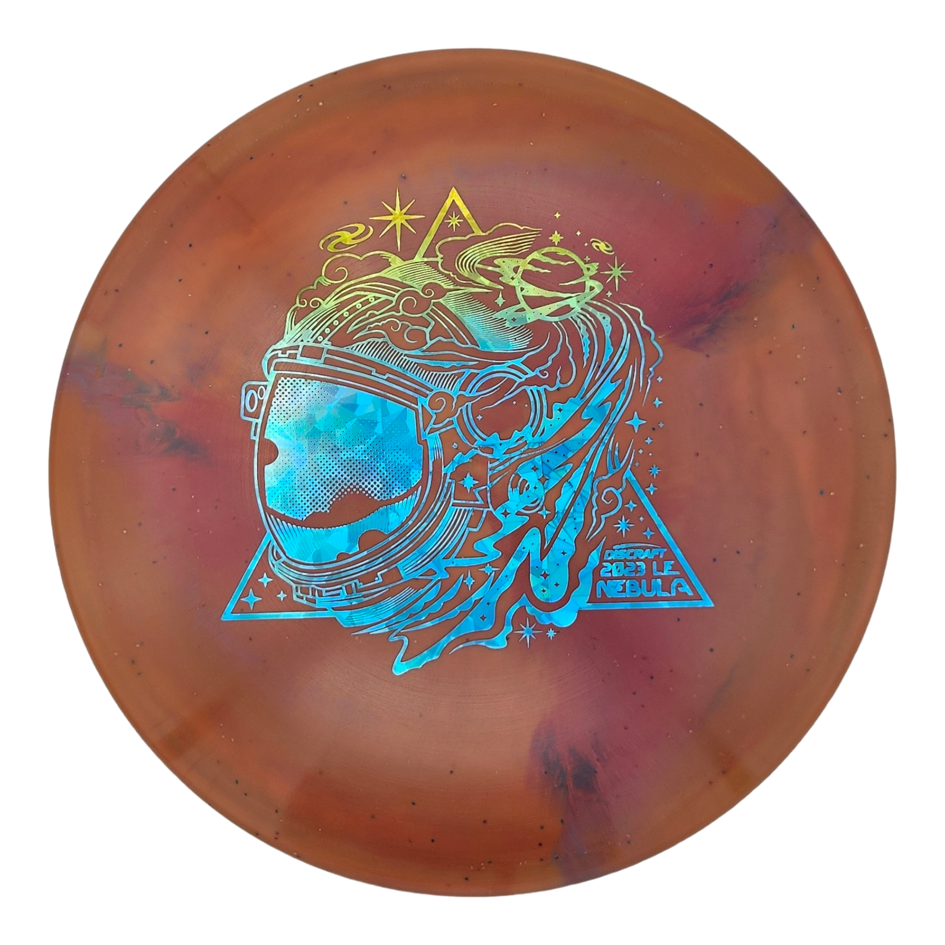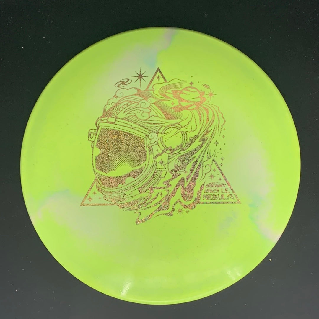 The Nebula was released in 2008 as Discraft’s Ace Race prototype and eventually became the predecessor to the Buzzz OS. Since then, the Nebula’s production has been discontinued at Discraft. That held true until the Ledgestone Edition Z Swirl Nebula was released as a limited run in 2021. The ESP plastic in this run increases grip and adds a tacky feel. These Nebulas all have vibrant swirls and a distinct shimmer with the metal flakes infused in the plastic. The stamp depicts the side profile of an astronaut helmet as the back end fades smoothly into a collection of galaxies, planets, and new stars in a nod to the disc mold’s name. This was part of a run of 1000 discs.