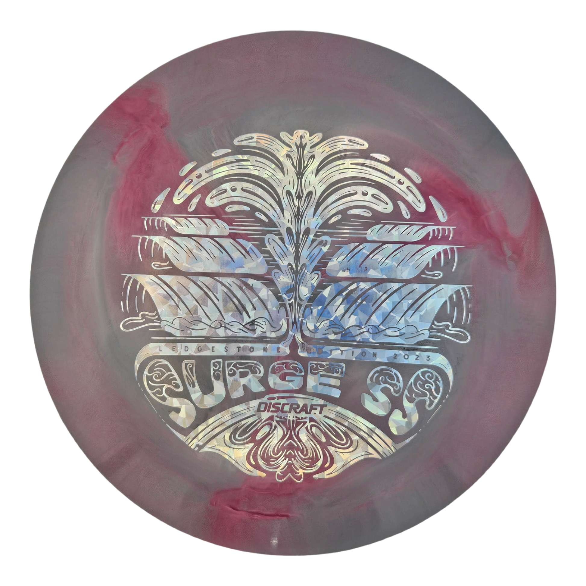 The Surge SS is a less stable version of the Surge that has a straighter edge. The Surge SS offers more control and a straighter flight than the Surge, and works well for recreational and intermediate players. This run of the Surge SS was part of a limited run of only 1000 in Discraft's ESP Swirl plastic.