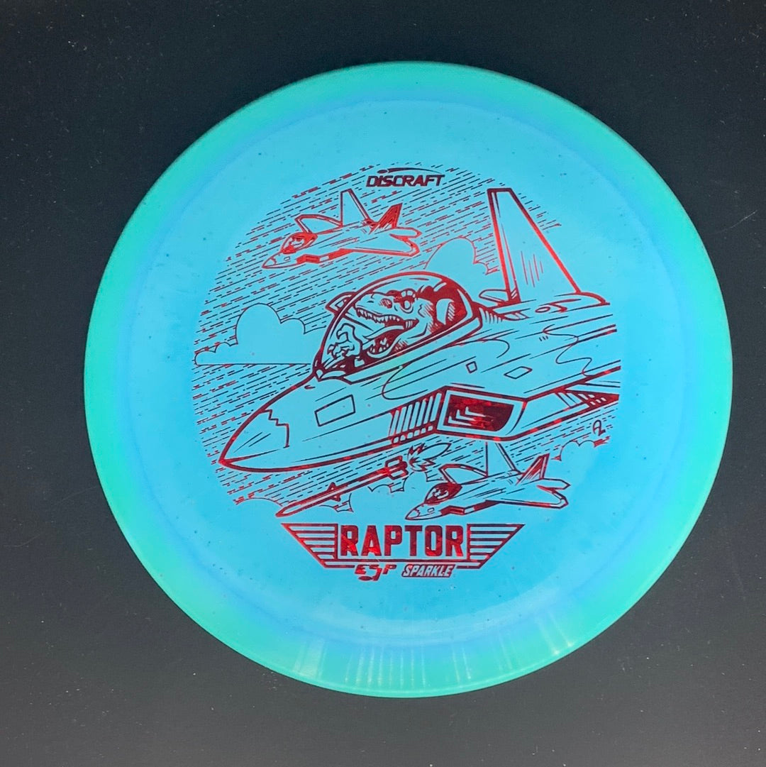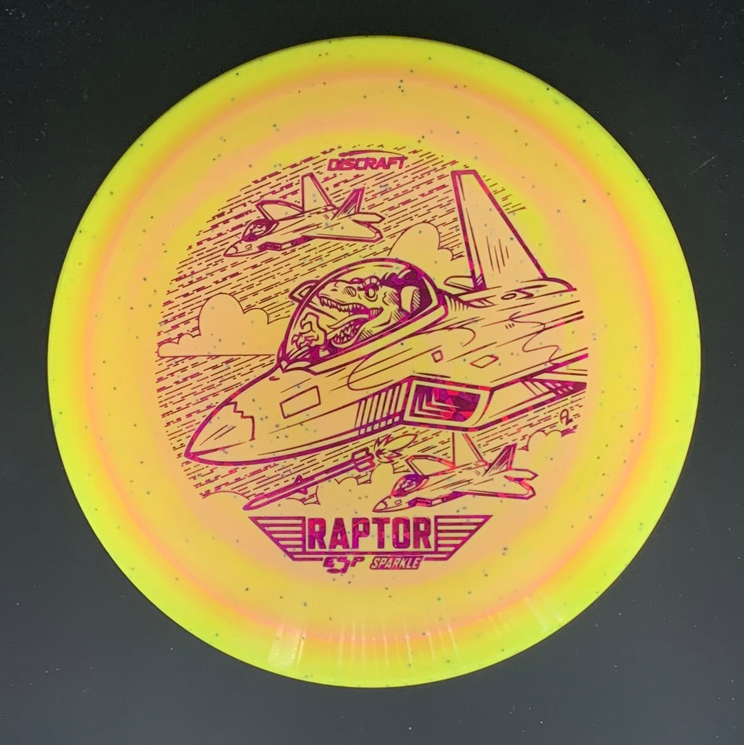 The Raptor is an overstable fairway driver capable of fighting strong winds. It has a flat flight plate and comfortable rim depth for both forehand and backhand grips. The ESP plastic in this run is tacky with a bit of flex for an amazing feel in the hand. The coloration in these Raptors produces a halo-like border around the rim. This particular run is much lighter than a standard produced run of Raptors, with weights ranging in the mid-to-low 160s. However, this run still maintains the trusted overstability of a stereotypical Raptor. The stamp features raptor dinosaurs flying fighter jets on an attack mission.